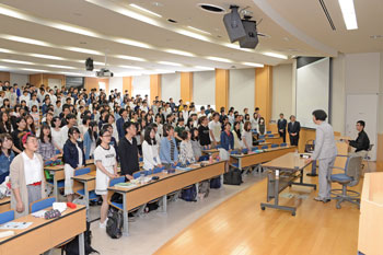 その後、学生たちからの相次ぐ質問にも丁寧に答えられた後、学生の発案により、NHK『あさが来た』の主題歌「365日の紙飛行機」(AKB48)を全員 で感謝を込めて合唱。最後に学生の代表から花束を贈呈し、大拍手に包まれて講演会は終了。文学部生の心に残る、感動の出会いの一日となりました。