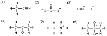 (1) エタンニトリル(アセトニトリル)、(2) 炭酸イオン、(3) オゾン、(4)プロパノン(アセトン)、(5)メチルアンモニウムイオン、(6)