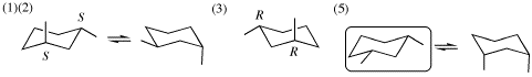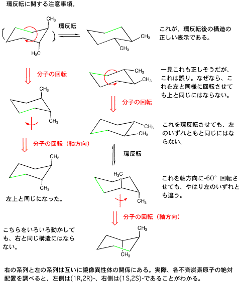 *(注意)trans-1,2-(2種類)、cis-1,3-(1種類)、trans-1,4-(1種類)置換体は、それぞれ環反転を起こすと形の異なる立体配座になる。cis-1,2-置換体が環反転を起こすと、もとの形と鏡像の関係にある立体配座になる。(1,1-、trans-1,3-、cis-1,4- 置換体は、置換基の一方がアキシャル方向、もう一方がエカトリアル方向であり、環反転を起こしても、もとと同じ形になる)。