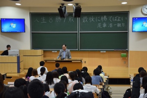 文学部人間学科の共通専門科目「人間学」の授業が6月23日(木)大教室棟で行われ、大相撲の元大関琴風の尾車親方が「人生8勝7敗-最後に勝てばよい」と題し講演を行いました。